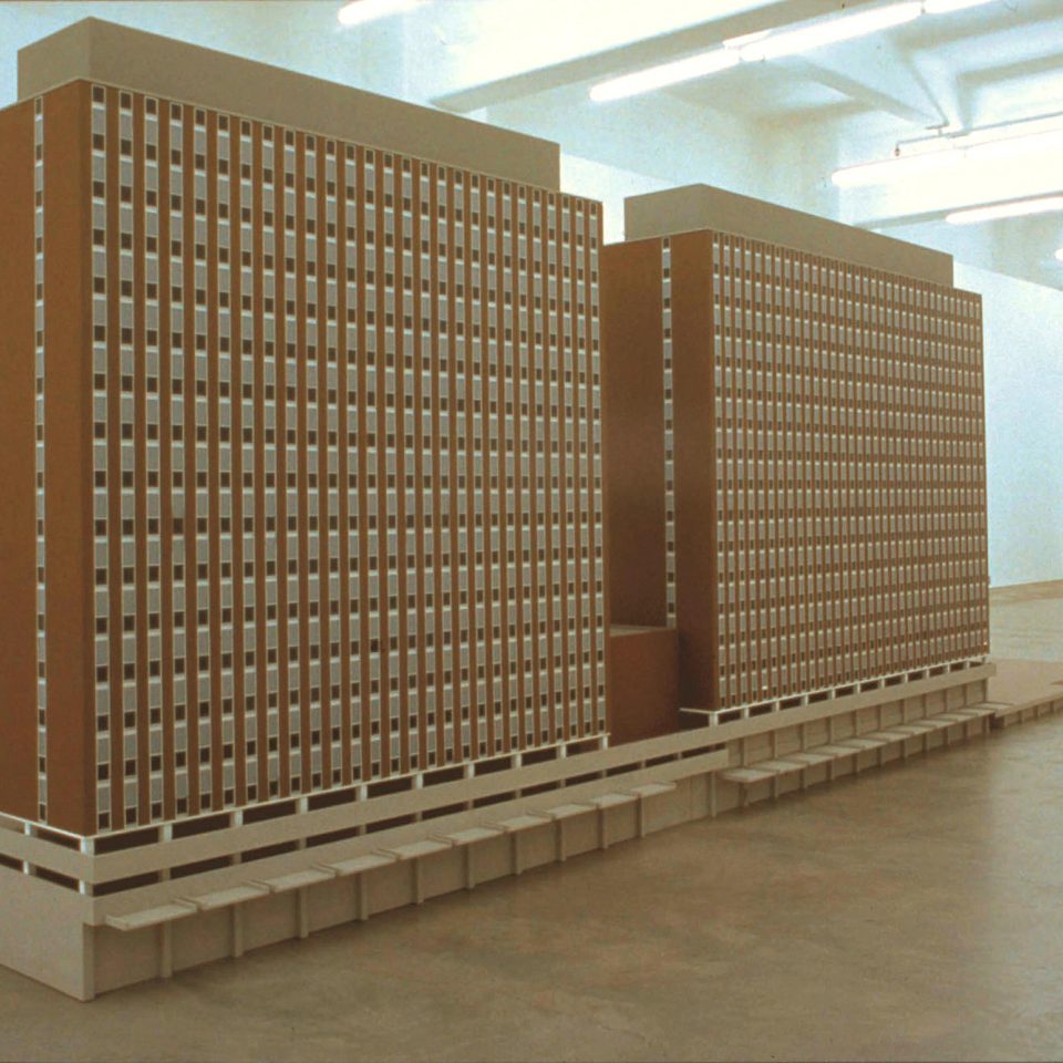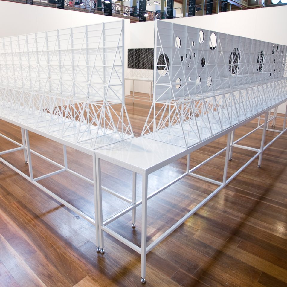 Callum Morton’s installation and sculptural practice is inspired by architecture and the built environment. His work has consistently addressed the ‘architecture of experience’ – the moment of encounter between viewer and object, or viewer and built environment. Often, his works explore human interaction with architectural space through scale models and facades of well-known buildings. For example, Morton represented Australia at the 2007 Venice Biennale with a scale model of his childhood home, designed and built in the 1970s in a modernist style by his architect father.