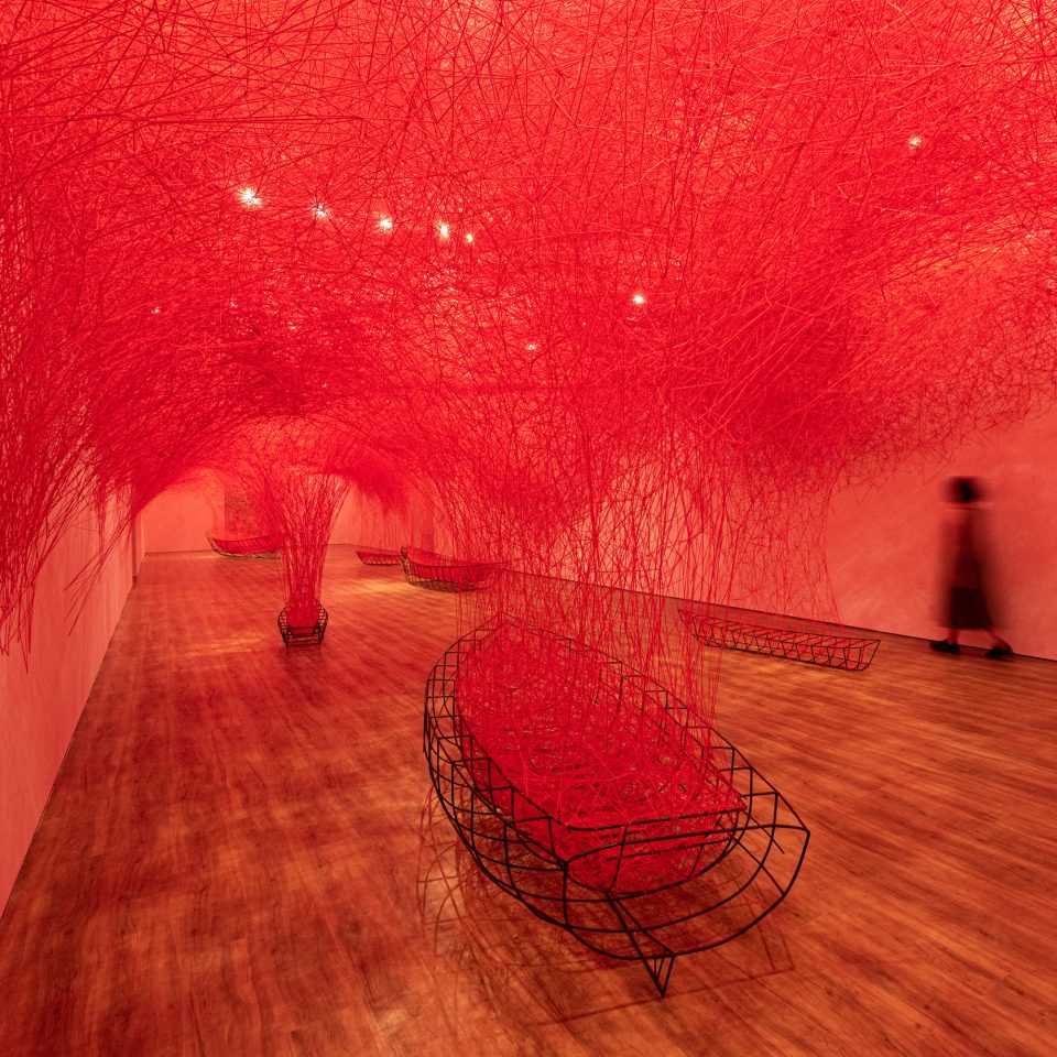 The largest solo exhibition of the artist’s work, The Soul Trembles, curated by Mami Kataoka, has been touring Australasia since its launch in 2019 at the Mori Art Museum, Tokyo, Japan. The Soul Trembles has been presented at Busan Museum of Art, Busan, South Korea; Taipei Fine Arts Museum, Taipei, Taiwan; Long Museum, Shanghai, China; Museum MACAN, Jakarta, Indonesia; and Queensland Art Gallery of Modern Art (QAGoMA), Brisbane, Australia, where it is currently exhibiting. Chiharu Shiota represented Japan at the 56th Venice Biennale in 2015, presenting The Key in the Hand in the Japanese Pavilion, curated by Hitoshi Nakano. Exhibitions include: Seven Dresses, Stadtgalerie, Saarbrücken (2015); Le Fil Rouge, Espace culturel Louis Vuitton, Paris (2015); Inhabiting the World, Busan Biennale (2014); Progress and Hygiene, Zacheta National Gallery of Art, Warsaw (2014); Over the Continents, Smithsonian Institution, Washington D.C. (2014); Home of Memory, La Maison Rouge, Paris (2011); Inner Voices, 21st Century Museum of Contemporary Art, Kanazawa (2011); Walking in My Mind, Hayward Gallery, London (2009); Breath of Spirit, The National Museum of Art, Osaka (2008).