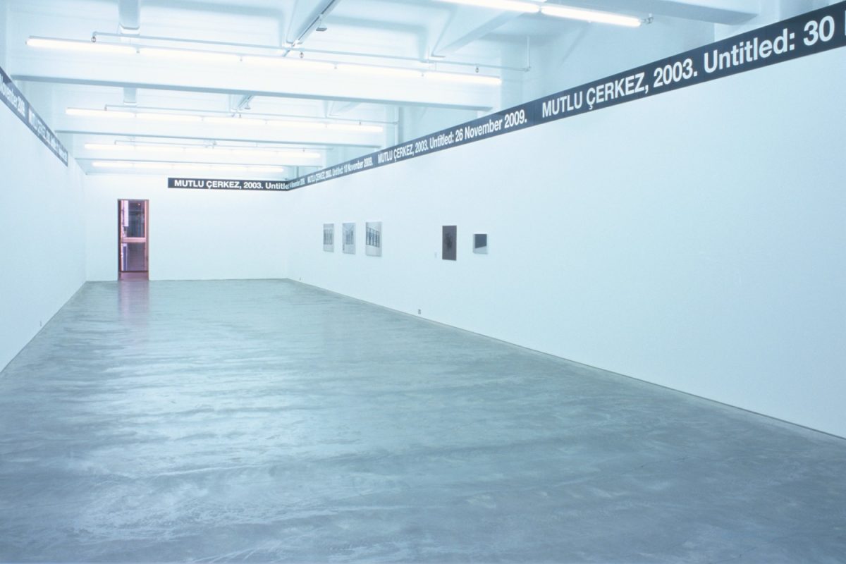 Mutlu Çerkez’s latest exhibition of new works includes a wall frieze and a series of paintings. The wall frieze lists the artist’s name and a series of dates in the future. The works, including Untitled: 14 November 2009, will be revisited in the future, at a time corresponding to the date in the work. This process is evident in the two paintings Untitled: 11 April 2003, 1988 and Untitled : 11 April 2003, 2003. Here we can view Çerkez’ process, whereby he has kept the appointment set for himself, creating a new work reflecting on the earlier piece.