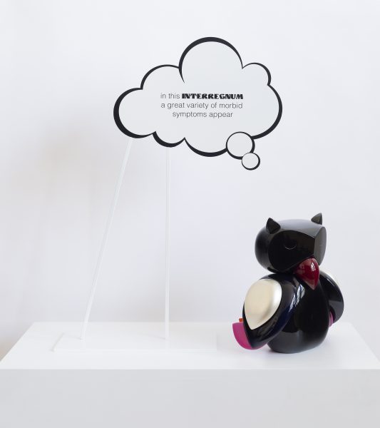 Owls gesture to the right, the centre, centre-left, centre-right and hard left. One glances at their raised pinion and a thought bubble ensues, “I’m worried about the rise of the right wing…” A book-like stack of philosophical quotations is placed next to each figure, cast in Linotype and encoded in reverse. Each maxim has been carefully curated to help these creatures transcend their polarised public sphere.