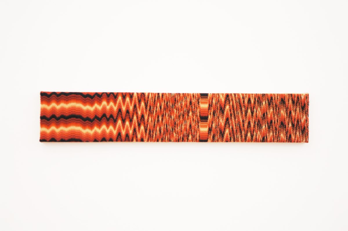 Starter Pistols is an exhibition of six bargello needleworks. The design of each needlework illustrates soundwaves associated with various anti-personnel weapons. Each soundwave is a mere one one-hundredth of a second in length and captures the split-second a weapon is discharged. One of the designs is based on the sound of the Browning 1910 handgun used by Gavrilo Princip to assassinate the Archduke Franz Ferdinand of Austria in 1914 and the others are all similarly trigger points in history.