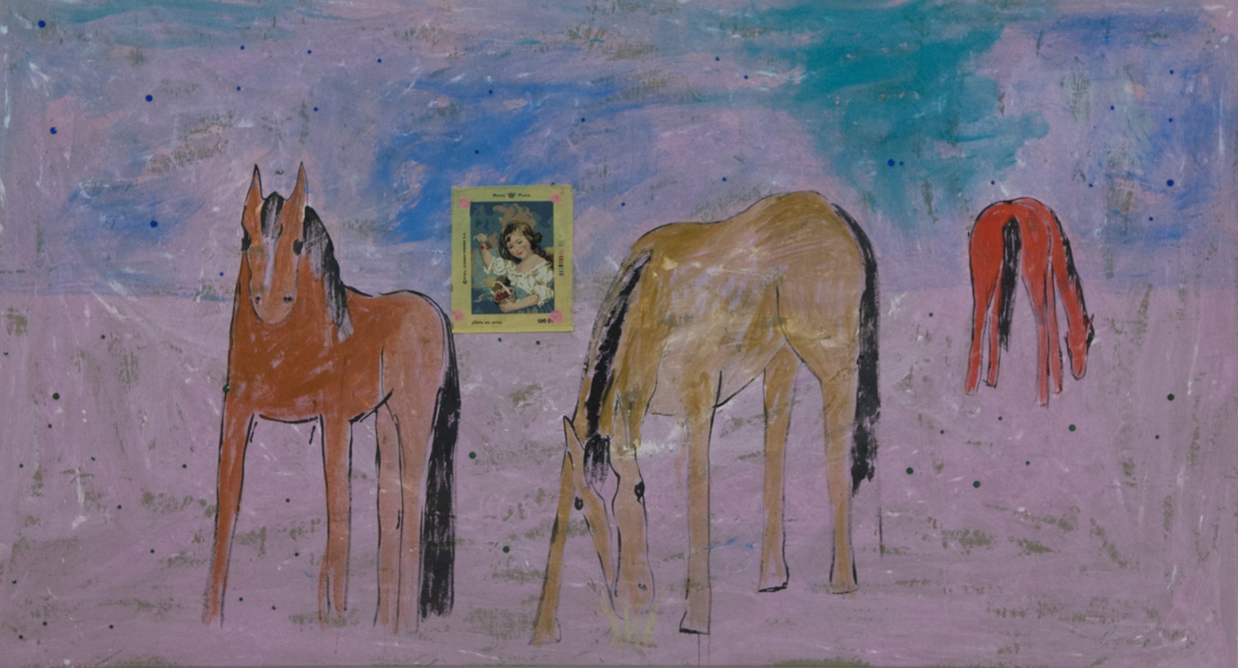 1970s and employs textiles collected on her travels as the surface for many of her paintings, which also often include collaged materials such as images from magazines, horse’s hair, ribbons, bows and sequins. Many of Watson’s works feature self-portraits and alter egos, a cast of longhaired women, horses, ballerinas, rock guitarists and cats, who enact life’s ongoing psychodramas. Intertwining autobiography and fiction, her work incorporates a diary-like voice that is delivered with deadpan wit and seems to relay the everyday experiences, dreams and desires of a self-proclaimed suburban girl. The relationship between text and image is central to her work, which frequently includes a small panel of hand painted text that sits alongside a larger image, undercutting or changing its meaning.”