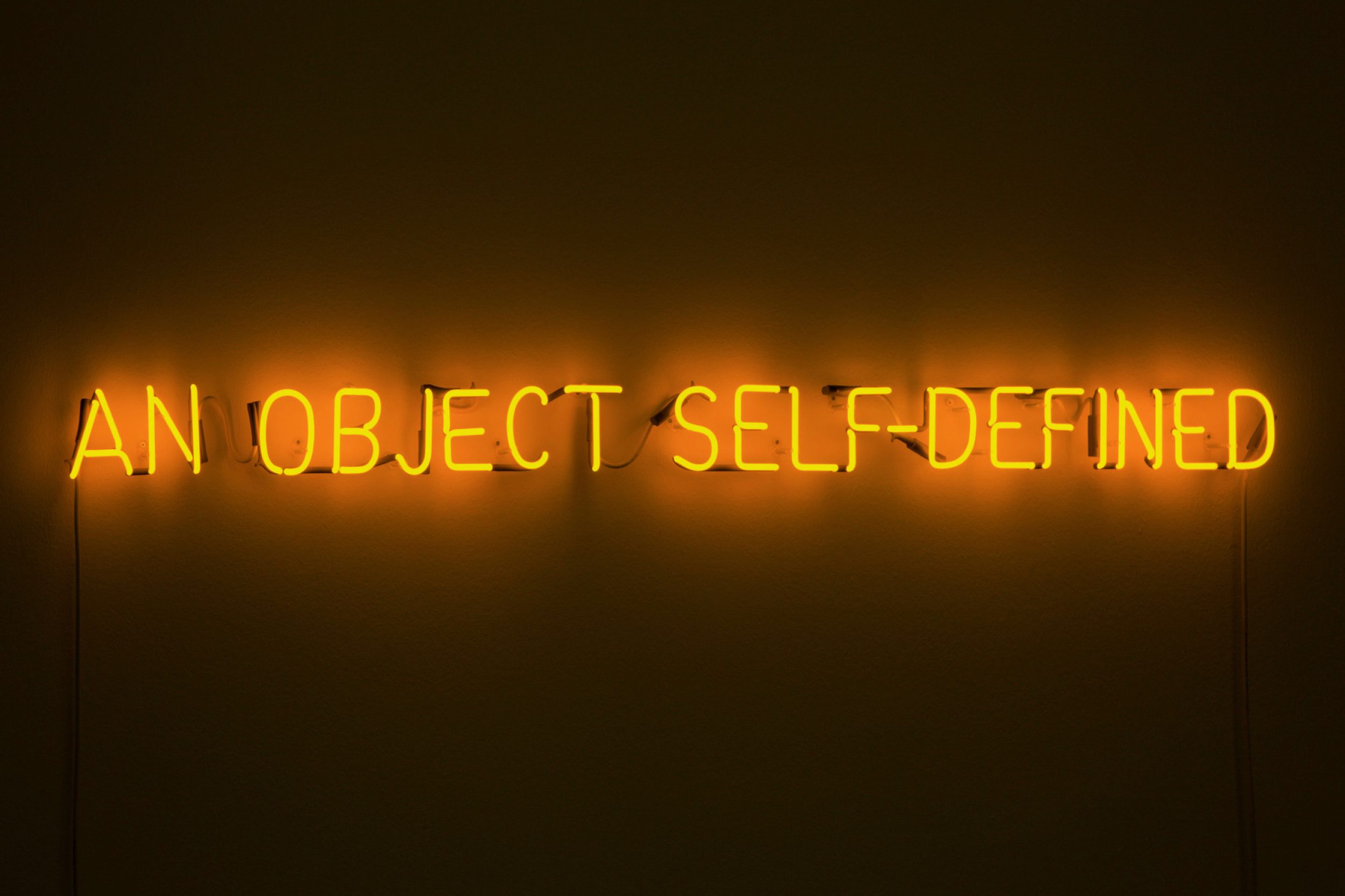 The three earliest works in the exhibition — Neon (1965), Five Fives (to Donald Judd) [Ruby Red] (1965), and Self-Defined Object [Orange] (1966) — are among Kosuth’s first forays into the commercial lighting medium of neon for which he is now best known.