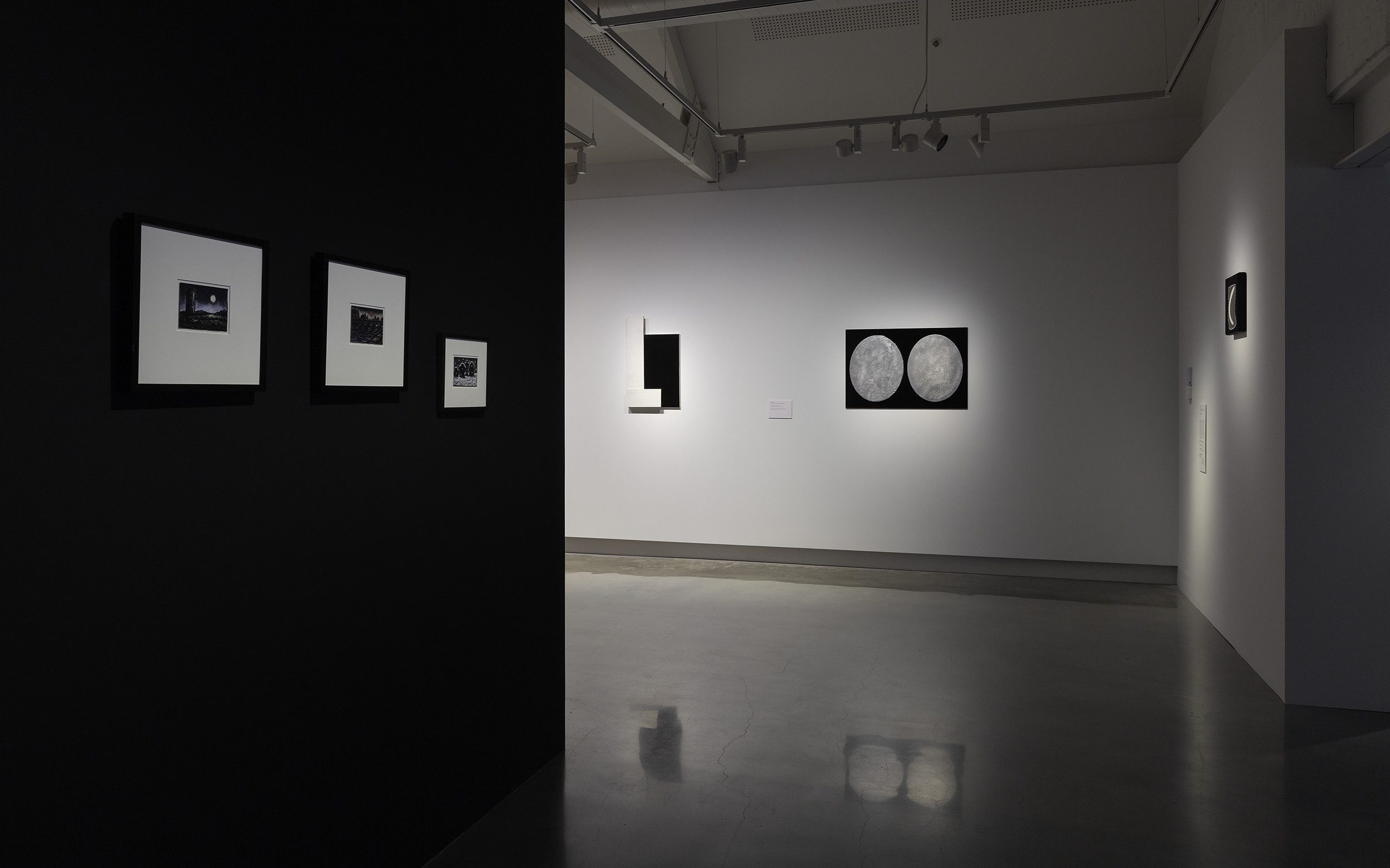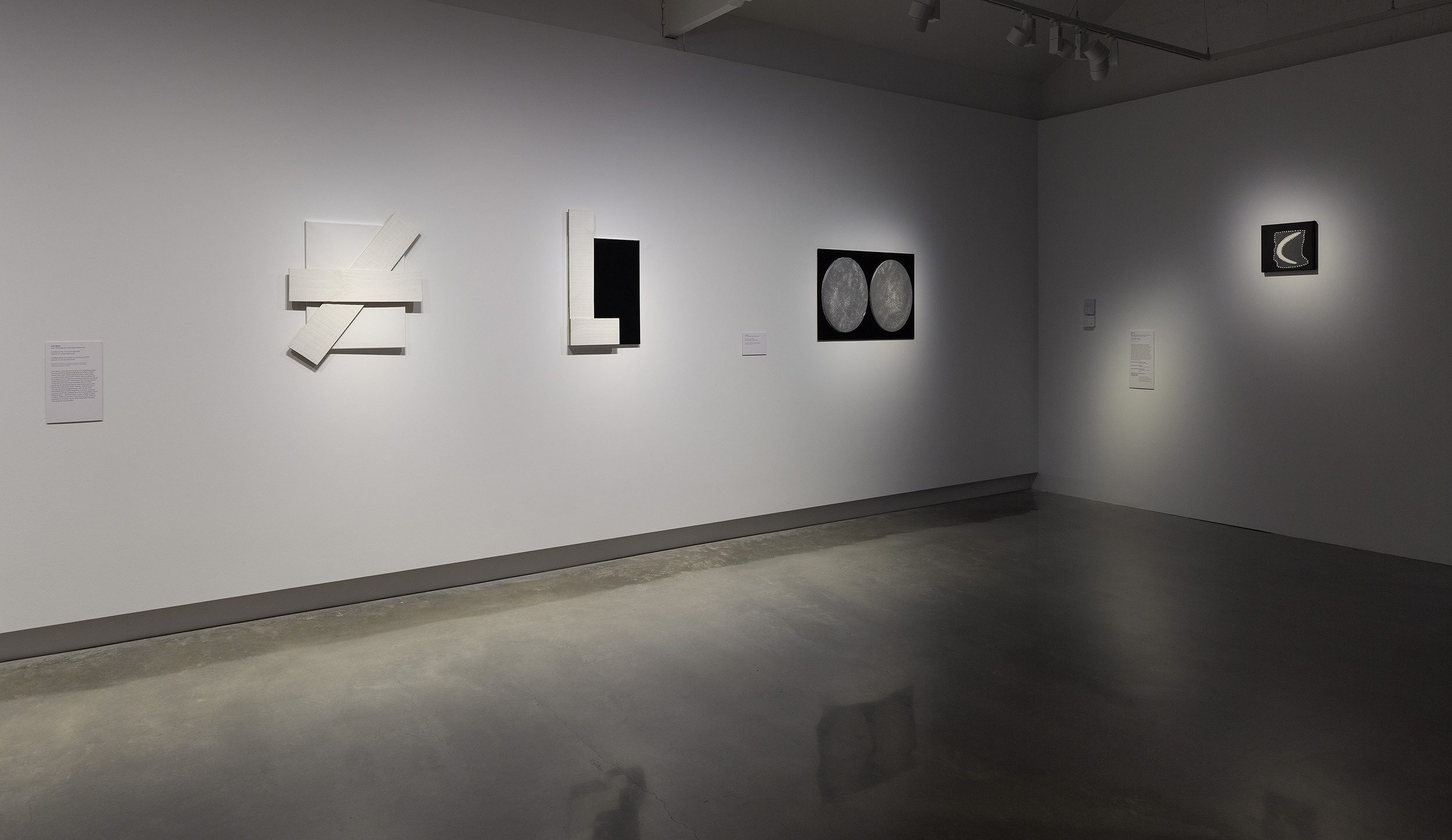 Installation view of nightshifts, Buxton Contemporary, the University of Melbourne, 2023. Featuring Peter Booth, Untitled [tower with moon] 1998, Untitled [red moon] 2000, Untitled [graveyard] 1998, John Nixon, Untitled (black and white monochrome) 2013, Silver Monochrome 2003 and Mabel Juli, Garn’giny Ngarrangkarni.Michael Buxton Collection, the University of Melbourne Art Collection. Courtesy of Anna Schwartz Gallery. Photography by Christian Capurro.