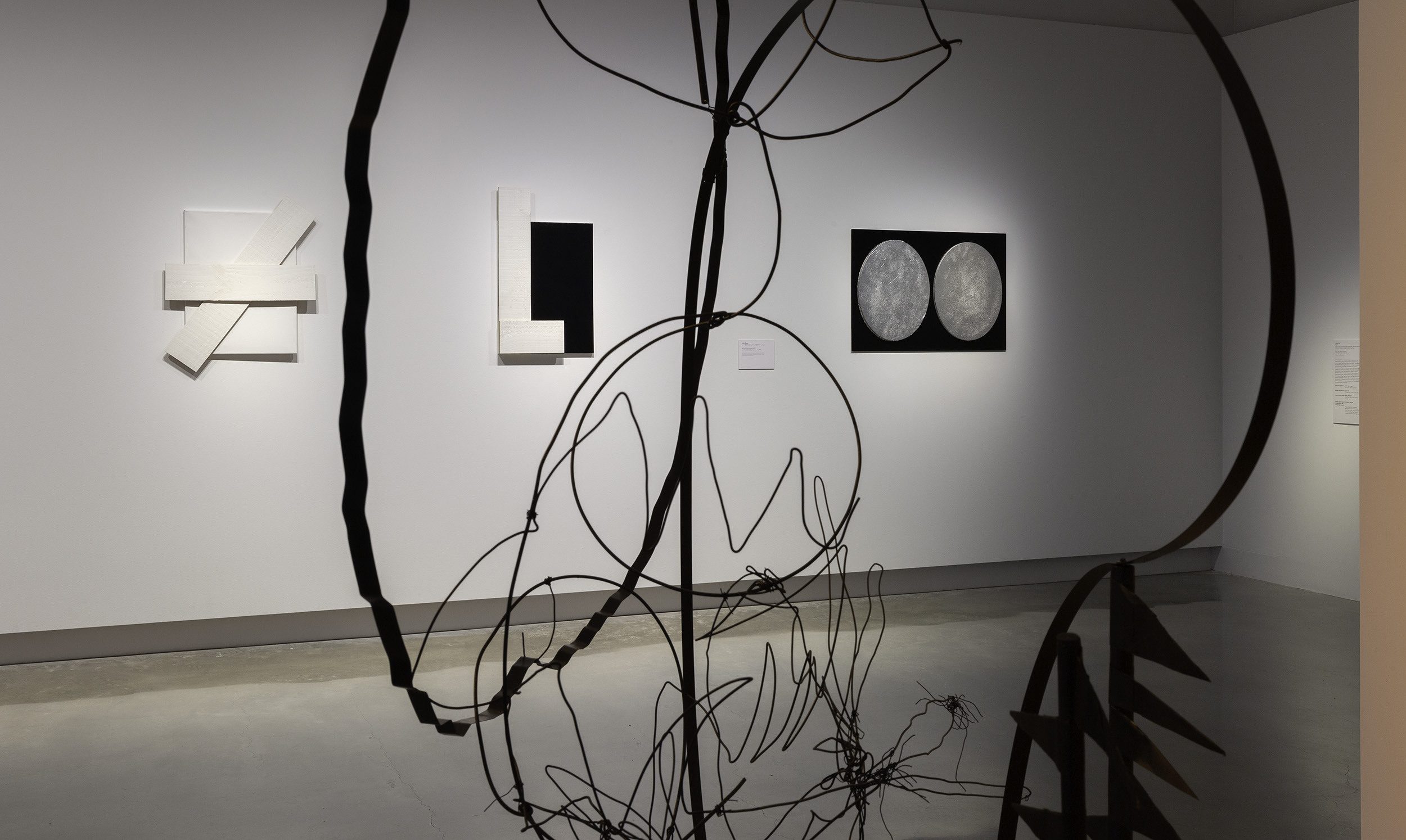 Installation view of nightshifts, Buxton Contemporary, the University of Melbourne, 2023. Featuring John Nixon, Untitled (white monochrome) 2011, Untitled (black and white monochrome) 2013, Silver Monochrome 2003 and Mabel Juli, Garn’giny Ngarrangkarni. Michael Buxton Collection, the University of Melbourne Art Collection. Courtesy of Anna Schwartz Gallery. Photography by Christian Capurro.