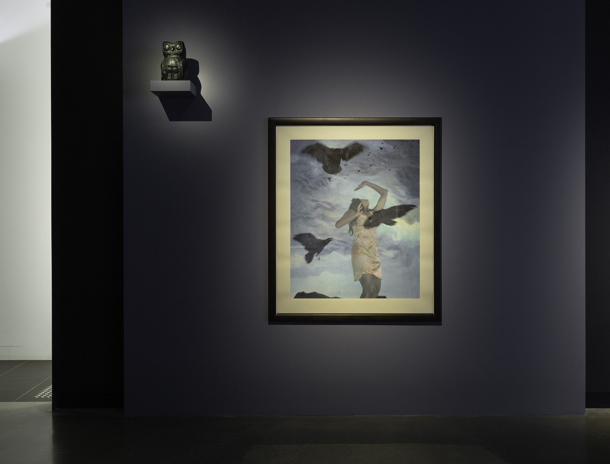 Installation view of nightshifts, Buxton Contemporary, the University of Melbourne, 2023. Featuring David Noonan, Owl 2006, Tracey Moffatt, Invocations #5 2000. Michael Buxton Collection, the University of Melbourne Art Collection. Photography by Christian Capurro.