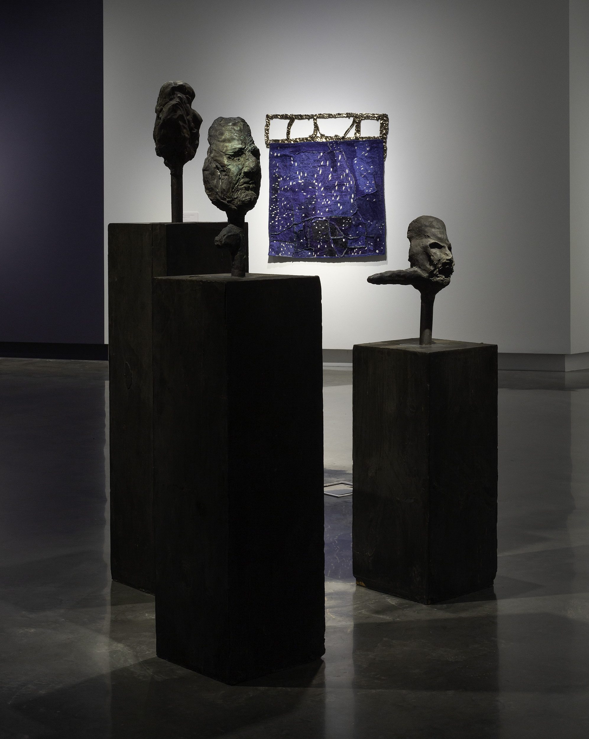 Installation view of nightshifts, Buxton Contemporary, the University of Melbourne, 2023. Featuring Mike Parr, Bronze Liars series 1996 and Teelah George, Sky Piece, Night (Melbourne) 2021. Michael Buxton Collection, the University of Melbourne Art Collection. Courtesy of Anna Schwartz Gallery. Photography by Christian Capurro.
