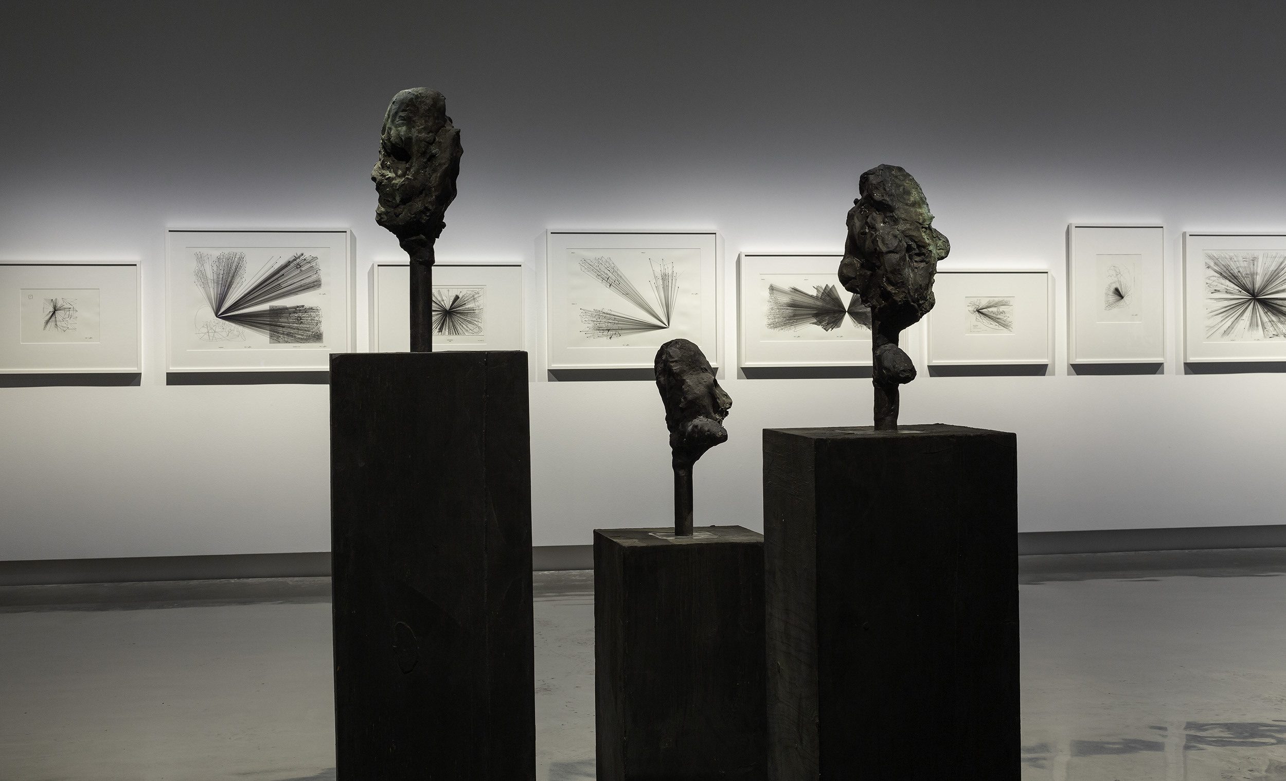 Installation view of nightshifts, Buxton Contemporary, the University of Melbourne, 2023. Featuring Mike Parr, Bronze Liars series 1996 and Marco Fusinato Mass Black Implosion series 2007-08. Michael Buxton Collection, the University of Melbourne Art Collection. Courtesy of Anna Schwartz Gallery. Photography by Christian Capurro.