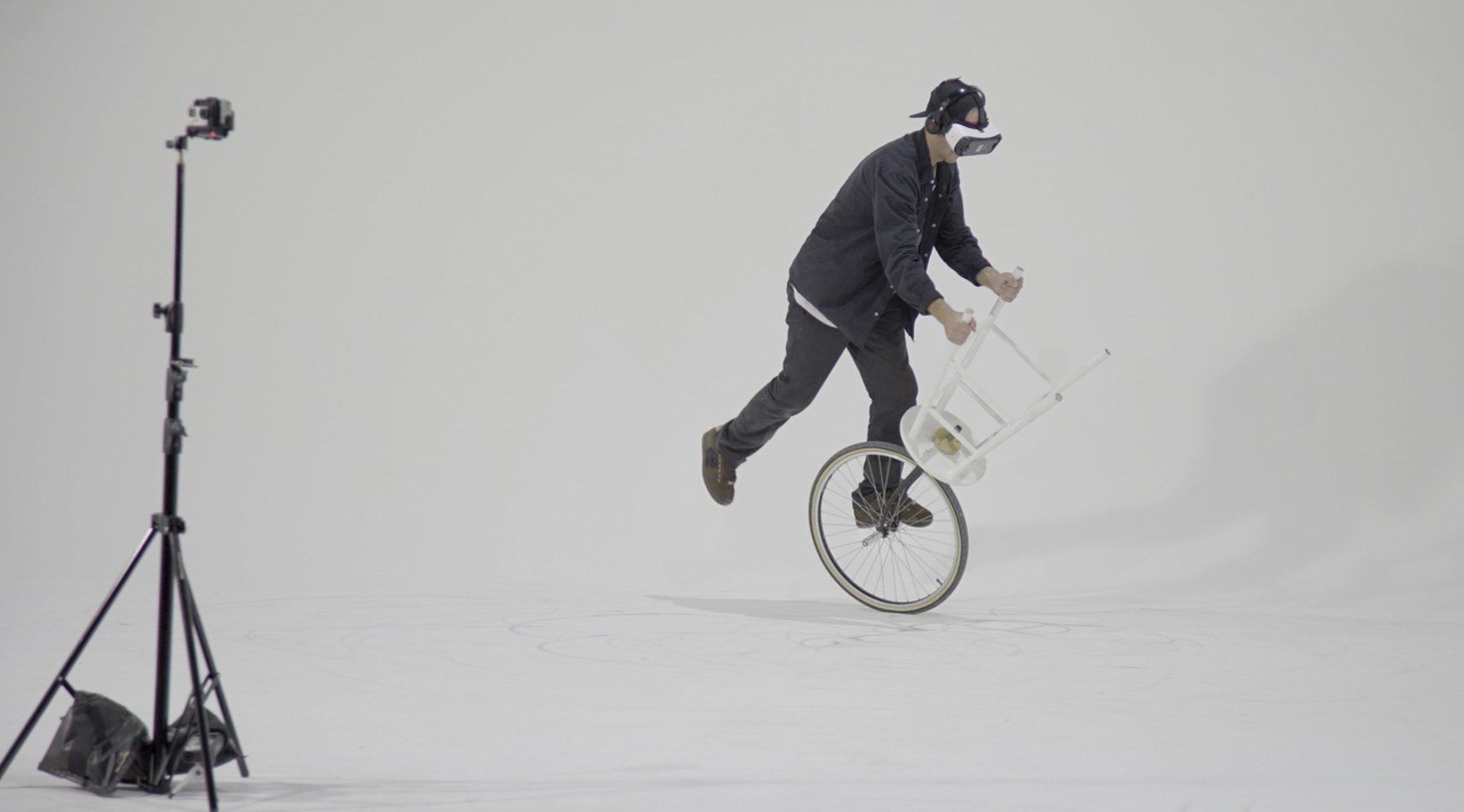 Appropriation continues to loom large in Gladwell’s recent projects, including the new commission Reversed Readymade (Augmented Reality) (2019). The work builds on Gladwell’s 2014 performance Reversed Readymade, in which BMX rider Matti Hemmings performed stunts on the artist’s replica of Marcel Duchamp’s iconic Bicycle Wheel (1913) sculpture. In the AR work, viewers witness BMX pro Simon O’Brien riding the replica as a unicycle in the gallery via the MCA smartphone app. The Dadaist sculpture, which removed the functionality of its components, is thus subverted through returning the wheel to its intended use. The initial excitement brought by AR technology, however, was overshadowed by its pitfalls: the program was only iOS compatible, glitches frequently occurred, and viewers struggled to locate O’Brien on their screens. Arguably, Reversed Readymade (Augmented Reality) contributed little to the experience of the work or the furthering of its concept, especially considering a 360-degree VR video of the same performance was produced in 2016.